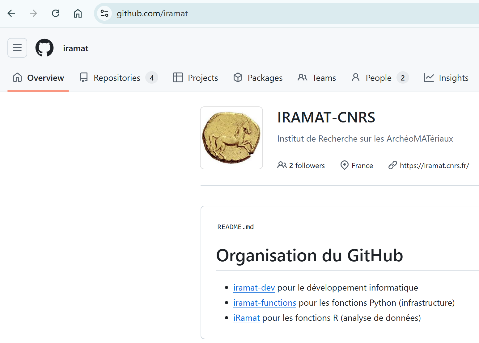 L’IRAMAT a une organisation GitHub https://github.com/iramat avec différents repositories: